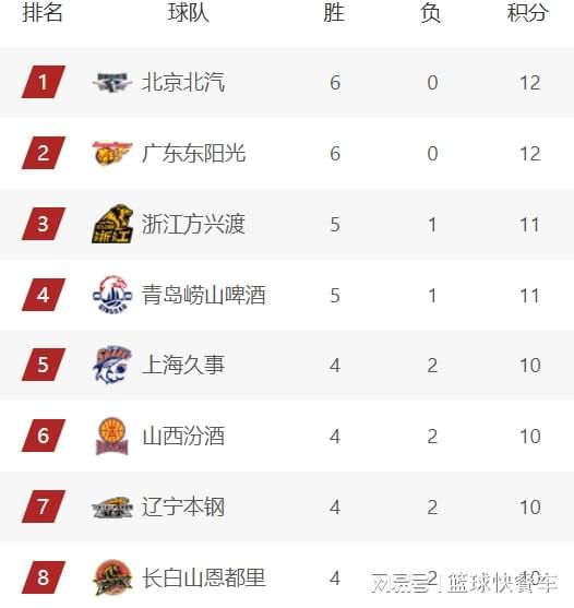 CBA常规赛第6轮全部战罢,广东、北京、山西以及新疆等队悉数出战,北京队和广东队继续高歌猛进,分别战胜新疆队和山东队,豪取6连胜。卫冕冠军广厦紧随其后,排在积分榜第三位,而青岛