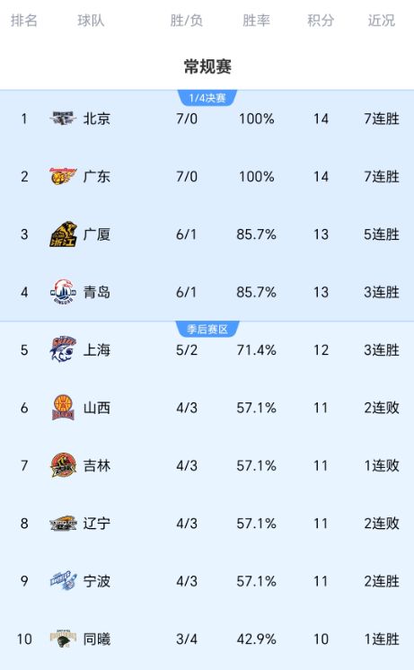 北京时间12月28日晚上,CBA常规赛迎来多场比赛,北京男篮、广东男篮继续全胜,稳居积分榜前二,卫冕冠军广厦男篮退居第三,组成争冠集团。另外青岛男篮延续了不俗表现,凭借6胜1负的战