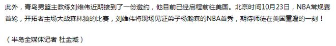 根据杜金城的报道:“青岛男篮主教练刘维伟近期接到了一份邀约,他目前已经启程前往美国。北京时间10月23日,NBA常规赛首轮,开拓者主场大战森林狼的比赛,刘维伟将现场见证弟子杨瀚森的NBA首秀,期待师徒在美国重逢的一刻!”