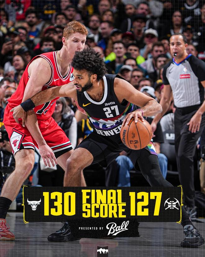 道苏姆2罚全中,距离终场仅剩11秒,芝加哥领先4分得以锁定大局。穆雷轰进续命远投,比赛仅剩1.7秒,许尔特2罚全中,约基奇绝平远投不进,比赛时间走完。最终,公牛以130比127准绝杀掘金,拒绝了18分逆转。丹佛的7连胜被终结,芝加哥止住了5连败。