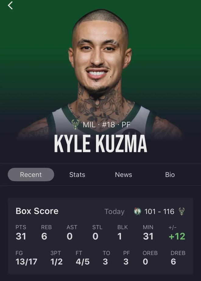 不惧强敌,雄鹿主场116-101击败凯尔特人。凯尔特人数据如下:雄鹿数据如下:库兹马难得爆发,竟然投篮17中13,以高达约76%命中率轰下31分外加6板;小波特继续强力输出,独揽18分10板13助,