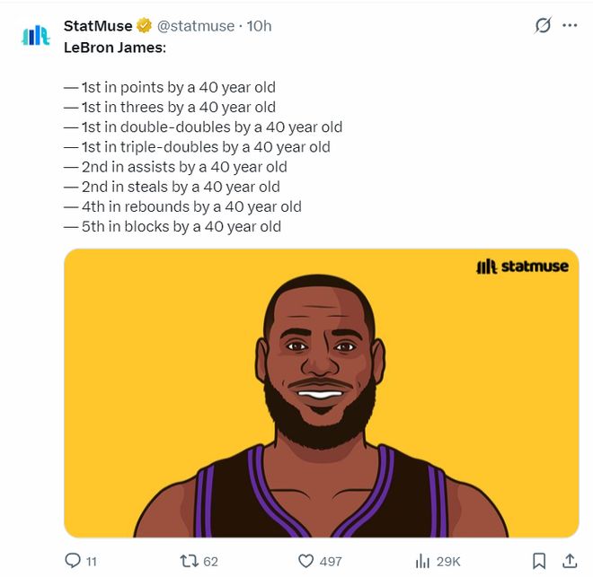 数据StatMuse媒体写道:40岁后得分第一,40岁后三分球第一、40岁后两双第一、40岁后三双第一、40岁后助攻第二、40岁后抢断第二、40岁后篮板第四、40岁后盖帽第五。