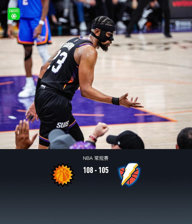 北京时间1月5日NBA 常规赛,菲尼克斯太阳对阵俄克拉荷马雷霆。半场太阳42-49雷霆,比赛第四节,古德延续外线火热手感,狄龙命中关键三分后却手滑失误将球权送给雷霆,杰威命中中投将比分扳平。最后8秒钟,布克横撤步三分一锤定音,米切尔绝平三分投出三不沾,最终太阳108-105雷霆。