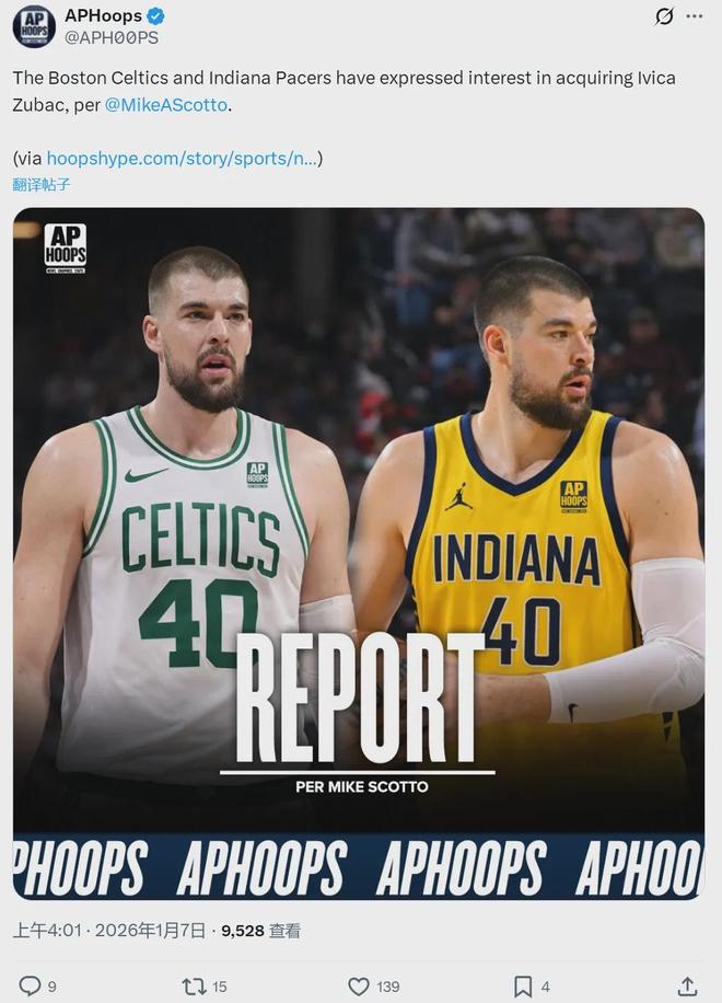 北京时间1月7日,据Hoopshype记者Michael Scotto报道,快船中锋祖巴茨在交易市场上引发多支球队的强烈追求,其中包括步行者和凯尔特人。快船同意交易祖巴茨,但是快船对祖巴茨的要