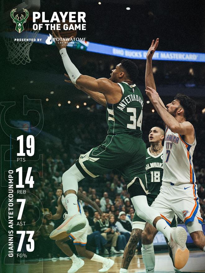 雄鹿队超级巨头扬尼斯阿德托昆博,在此役展现了全能身手。字母哥登场31分钟,投篮11中8,罚球6中3,砍下了19分14篮板7助攻1抢断的两双数据,正负值-11。字母哥以72.7%的命中率砍下了全队的最高分,他还是此战的篮板王。同时,字母哥的2个前场篮板也冠绝全场。