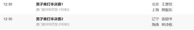 其中,乒乓球男单半决赛时间最终确定,两场半决赛将同时在11月15日12时30分开打,1号球台为上海队樊振东对北京队王楚钦,2号球台为辽宁队袁励岑对海南队林诗栋。