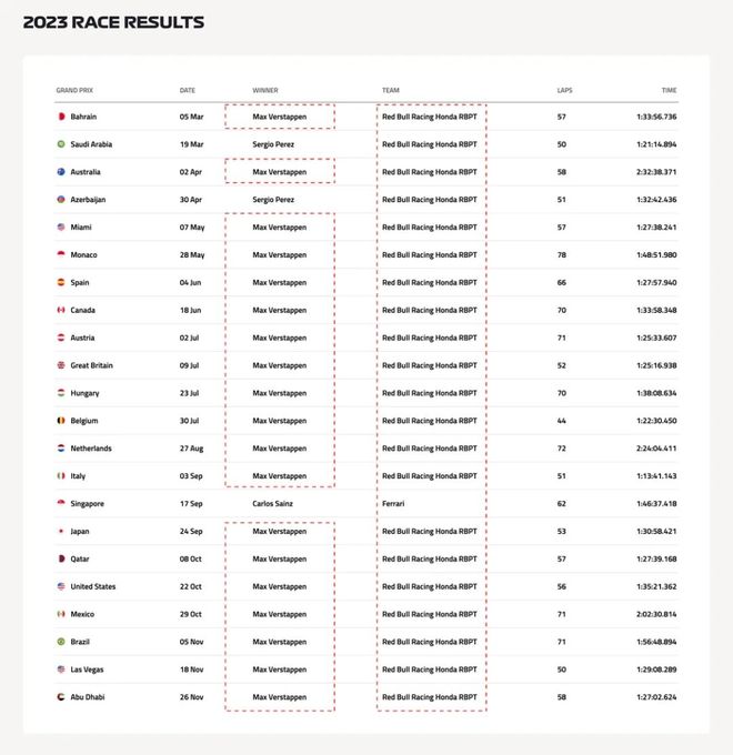 红牛车队的维斯塔潘在 2023 年以压倒性优势赢下了当年的绝大多数比赛