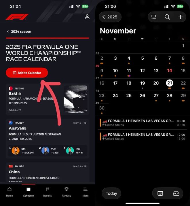 可以直接使用「Formula 1」app 提供的功能,前往对应页面点击「添加至日历」,即可将赛程添加至手机日历,之后就可以在手机的系统日历中看到比赛信息了。