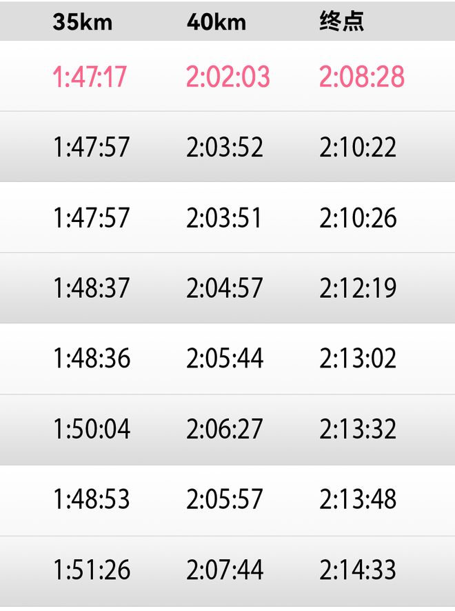 武明瑶在30公里后确立优势,最终以2:12:18获得国内亚军。董国建虽然被拉爆,但依然维持住了节奏,在冲线前激动甩掉帽子,以2:13:02获得国内第三。