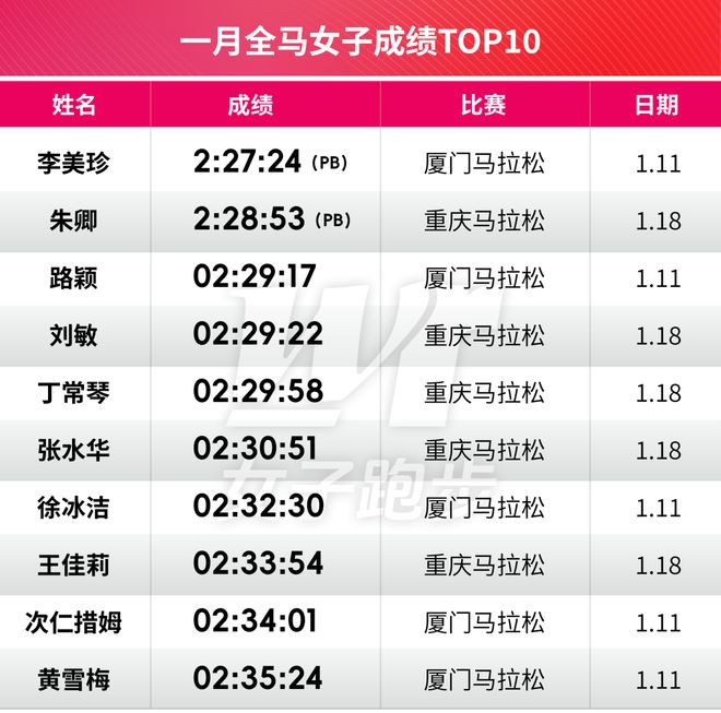 过往每年的1月,白金标厦马成为年度大型赛事的独苗。如今,随着金标赛事重马的提档,让今年1月,出现了厦马和重马的背靠背之战。而这个月,全马男女TOP10的成绩也皆出自重庆和厦门。