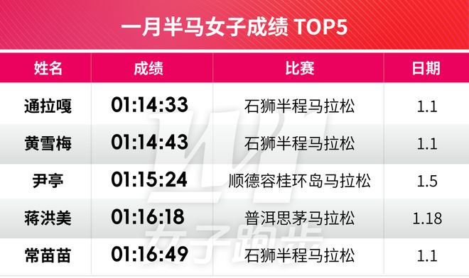 在1月的半马排行榜上,出现了一些亮眼的名字,比如00后的选手通拉嘎在福建石狮半程马拉松上,以最后200米绝杀黄雪梅的方式战胜了对手。虽然114的成绩还不及她的半马PB,但足以送她登上1月半马的NO.1,她在赛后也表示,这是一场足够让她获取自信心的比赛。另一位凭借半马成绩上榜的尹亭,不光半马表现不错,她在今年厦马跑出2:38:18,时隔近两年PB。