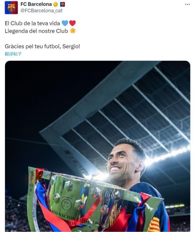 随后,巴萨官方发文:“你一生的俱乐部❤️我们俱乐部的传奇感谢你的足球,布斯克茨!”
