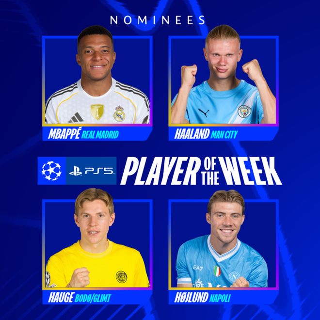 雷速体育10月2日讯 欧冠联赛阶段次轮战罢,欧冠官方发布了本轮的最佳球员候选名单,姆巴佩(皇家马德里)、哈兰德(曼城)、海于格(博德闪耀)和霍伊伦(那不勒斯)成功入选。