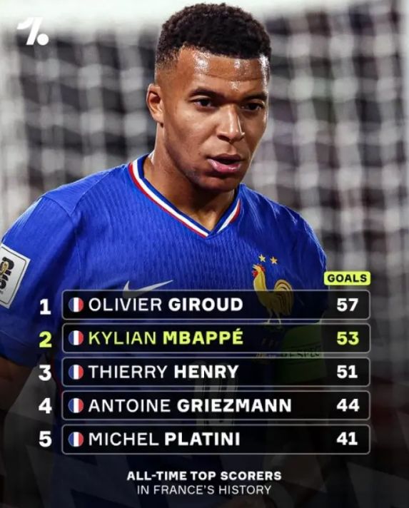 在对阿塞拜疆一战一传一射之后,姆巴佩93次为国家队出场已经打入53球。《马卡报》指出,“在2026年,姆巴佩将冲击两大纪录。”
