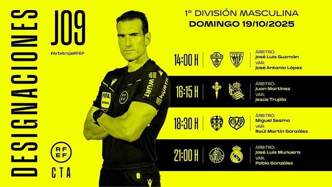 西班牙足协官方公布了周日西甲比赛裁判安排,何塞-穆努埃拉将执法赫塔费vs皇马。