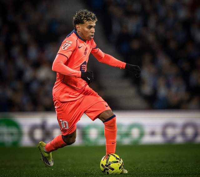 亚马尔奔跑庆祝,但VAR介入,与主裁吉尔-曼萨诺进行沟通。曼萨诺单臂高举,示意亚马尔越位在先,进球无效。