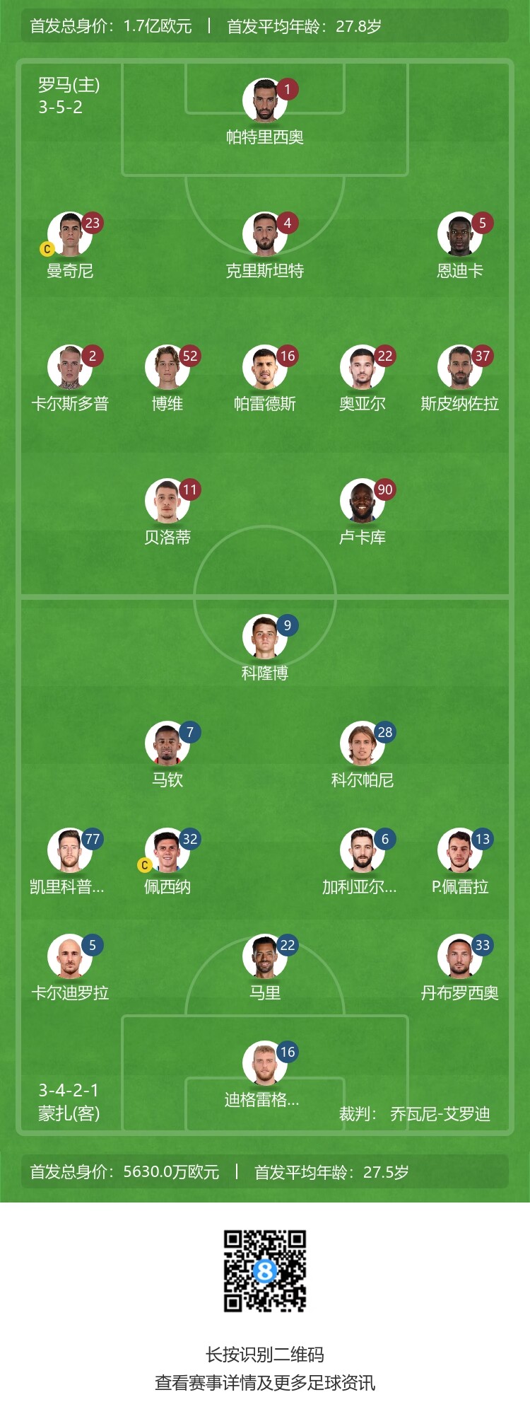 罗马首发:1-帕特里西奥、23-曼奇尼、4-克里斯坦特、5-恩迪卡、2-卡尔斯多普、52-博维、16-帕雷德斯、22-奥亚尔、37-斯皮纳佐拉、11-贝洛蒂、90-卢卡库