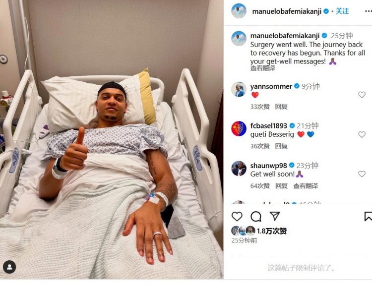 阿坎吉社媒晒照:手术进行得很顺利,康复之旅已经开始