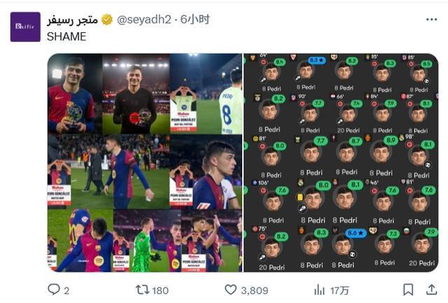 球迷晒出佩德里表现、媒体评分合集图并写道:耻辱