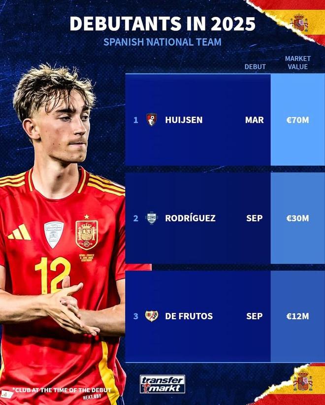 北京时间10月16日,德转列出了2025年完成西班牙国家队首秀的球员,今年到目前为止德拉富恩特仅给了三名球员完成国家队首秀的机会,今夏转会皇家马德里的赫伊森领衔。德转列2025年