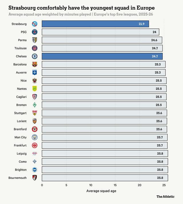 切尔西球迷已经看到了BlueCo商业模式的效果,即投资年轻天才并在他们成长过程中提升其价值,但斯特拉斯堡将这一理念提升到了另一个层次。平均年龄21.9岁,斯特拉斯堡轻松拥有欧洲五大联赛中最年轻的阵容——比最接近的俱乐部(巴黎圣日耳曼,24岁)年轻两岁多。
