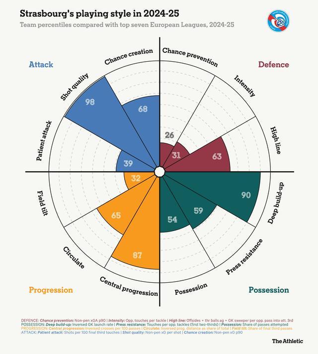 如上图所示,斯特拉斯堡不那么注重领土主导权(球场倾斜度,32/99)。他们的中路推进并不必然意味着缓慢、耐心的进攻(39/99),而是在空当出现时寻求快速向前加速——在对手阵型被破坏时制造高质量的射门机会(射门质量,98/99)。