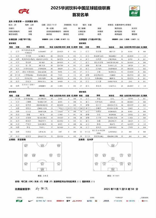 北京时间11月1日15:30,中超第29轮继续进行,北京国安作客长春体育中心体育场挑战长春亚泰,本场主裁判为王竞,VAR裁判为张雷,赛前双方首发出炉。